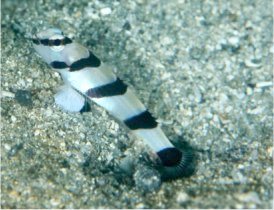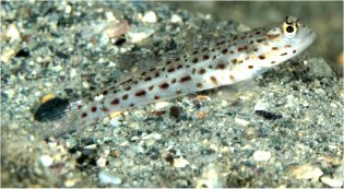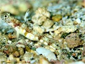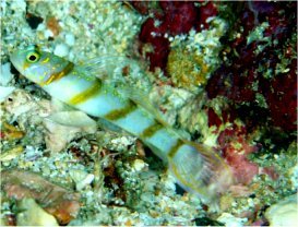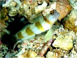 内湾の湾口やサンゴ礁域の砂底や砂泥底に生息します。体長は6cm程度で、第1背鰭に小さな黄色斑が点在すること、頭部から尾部にかけて5つの横帯があり尾鰭基底の6本目は不明瞭なことなどが特徴です。テッポウエビ類と共生します。