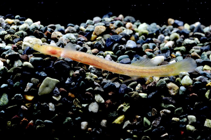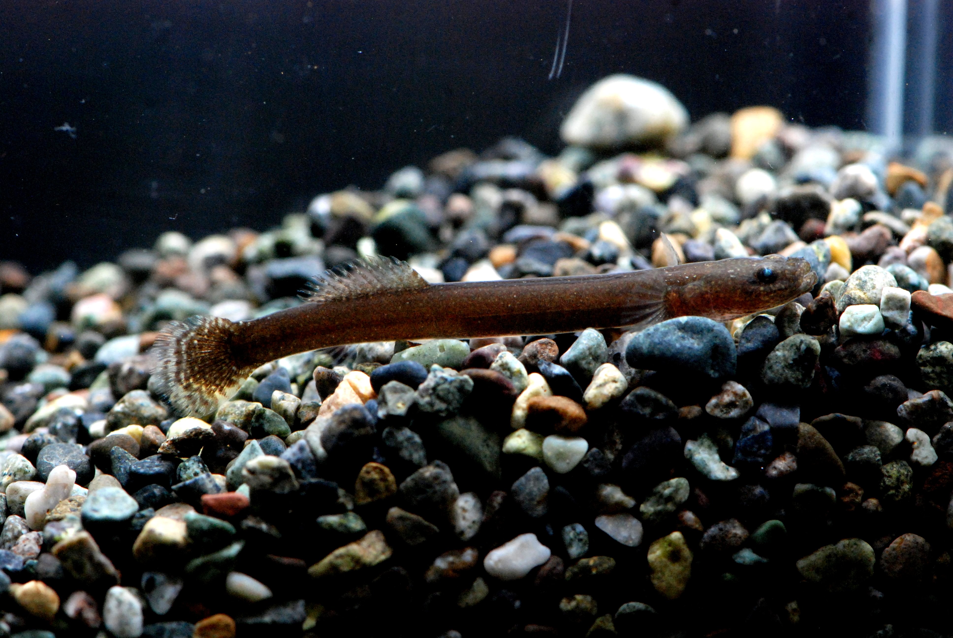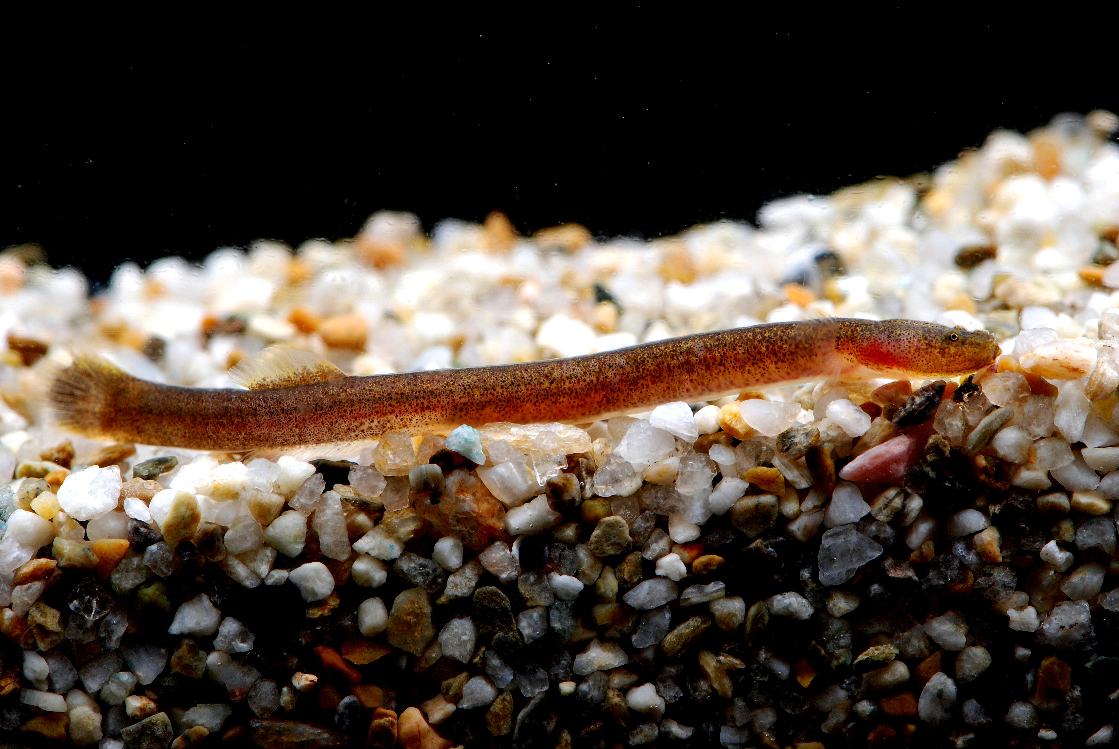 河口に近い地下水が湧き出る場所に生息しています。 詳しい生態は不明です。 眼が皮膚に埋もれてしまっています。体はオレンジ色っぽいのですが、長期間飼育していると茶色がかった体色になります。