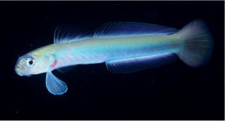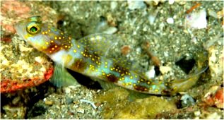 和歌山県沿岸の浅い砂泥底にすんでいるようです。胸鰭に遊離軟条はなく、眼の下に青輝色の模様があること、オスは第1背鰭に黒色斑がある(画像個体)ことが特徴です。