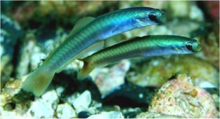 静岡県以南の黒潮の影響がある沿岸淡水域に生息します。体長は4㎝程度でオスは鮮やかなメタリックブルーや朱色を帯び、観賞魚としての人気もあります。メスは地味な色彩です。南西諸島には類似種が複数生息しています。